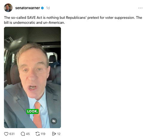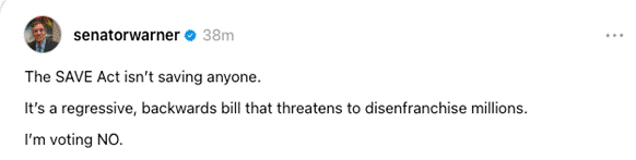 “We support reasonable steps that help maintain trust in our elections, including the voter identification requirements we already have in Virginia. But the SAVE America Act goes far beyond that – it is a pretext for voter suppression. Republicans continue to raise baseless fears about election fraud and noncitizen voting, despite the fact that our elections are regularly audited and have also been tested repeatedly in courts, especially after 2020. Yet, no evidence of widespread voter fraud has ever been found. This bill is yet another extension of President Trump’s fixation on the 2020 election, and part of a broader effort to undermine confidence in our democracy ahead of 2026 and 2028.”