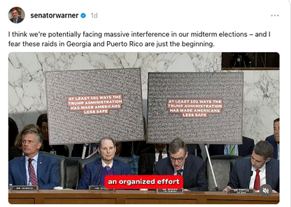 For months, Sen. Warner has been closely monitoring Gabbard’s efforts to seize voting materials in Fulton Country and Puerto Rico. He’s consistently made it clear this could all serve as a pretext to manufacture fraud allegations and justify “taking over” the 2026 midterms – you can catch up with a video he produced on the topic here.
