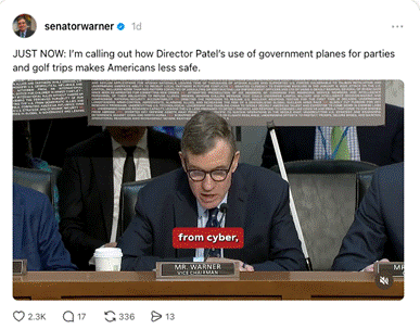 Sen. Warner raised concerns about Patel’s mismanagement of the FBI budget, saying: